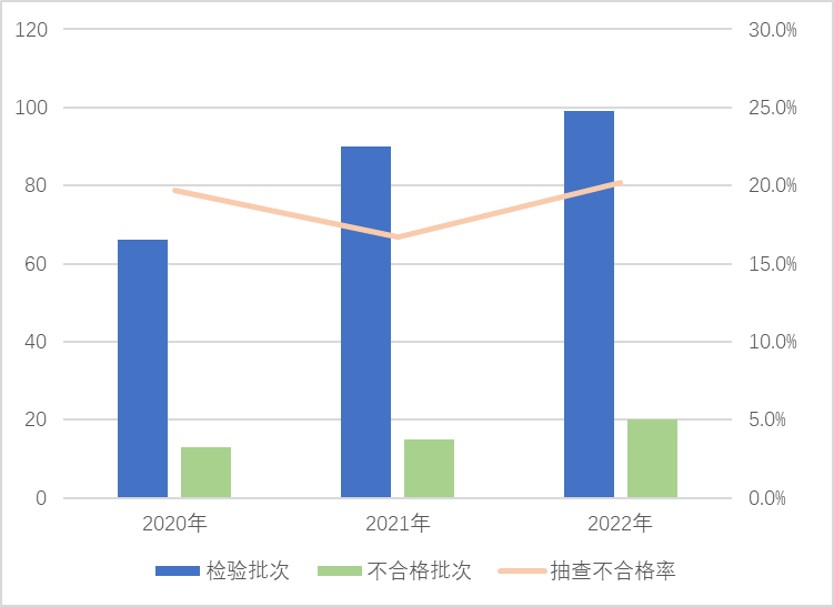 本次抽查12個(gè)省(區(qū)、市)99家企業(yè)生產(chǎn)的99批次產(chǎn)品,發(fā)現(xiàn)20批次產(chǎn)品不合格,抽查不合格率為20.2%,較上次抽查上升3.5個(gè)百分點(diǎn)。該產(chǎn)品近3年抽查不合格率分別為19.7%、16.7%、20.2%。