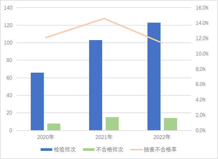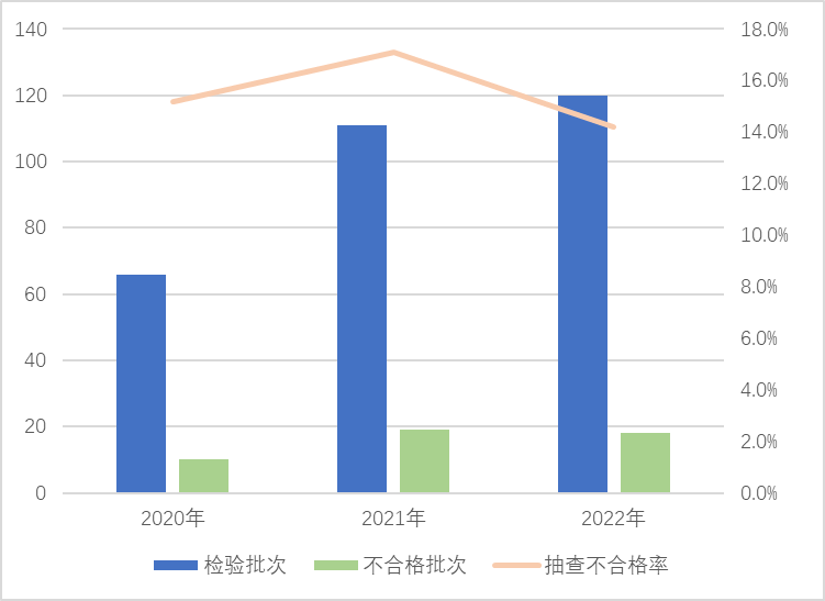 本次抽查10個(gè)?。ㄊ校?20家企業(yè)生產(chǎn)的123批次產(chǎn)品,發(fā)現(xiàn)14批次產(chǎn)品不合格,抽查不合格為11.4%,較上次抽查下降3.2個(gè)百分點(diǎn)。該產(chǎn)品近3年抽查不合格率分別為12.1%、14.6%、11.4%。