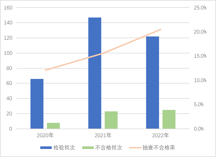 本次在流通領(lǐng)域進(jìn)行抽查,覆蓋11個(gè)?。▍^(qū)、市)121家企業(yè)生產(chǎn)的122批次產(chǎn)品,發(fā)現(xiàn)25批次產(chǎn)品不合格,抽查不合格率為20.5%,較上次抽查上升4.9個(gè)百分點(diǎn)。該產(chǎn)品近3年抽查不合格率分別為12.1%、15.6%、20.5%。