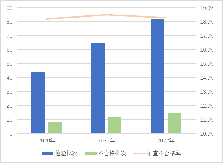 本次抽查5個(gè)省80家企業(yè)生產(chǎn)的82批次產(chǎn)品,發(fā)現(xiàn)15批次產(chǎn)品不合格,抽查不合格率為18.3%,較上次抽查下降0.2個(gè)百分點(diǎn)。該產(chǎn)品近3年抽查不合格率分別為18.2%、18.5%、18.3%。