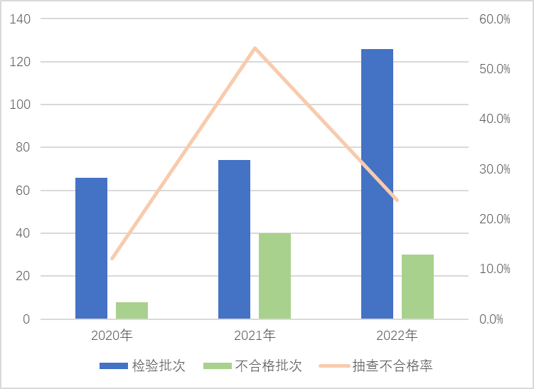 本次在流通領(lǐng)域進(jìn)行抽查,覆蓋9個(gè)省(區(qū)、市)81家企業(yè)生產(chǎn)的126批次產(chǎn)品,發(fā)現(xiàn)30批次產(chǎn)品不合格,抽查不合格率為23.8%,較上次抽查降低30.3個(gè)百分點(diǎn)。該產(chǎn)品近3年抽查不合格率分別為12.1%、54.1%、23.8%。