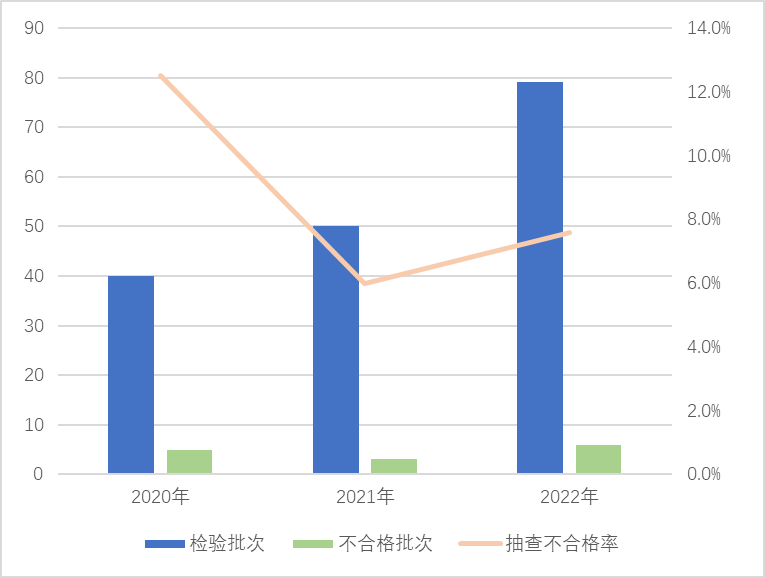 本次抽查7個?。ㄊ校?9家企業(yè)生產(chǎn)的79批次產(chǎn)品,發(fā)現(xiàn)6批次產(chǎn)品不合格,抽查不合格率為7.6%,較上次抽查上升1.6個百分點(diǎn)。該產(chǎn)品近3年抽查不合格率分別為12.5%、6.0%、7.6%。