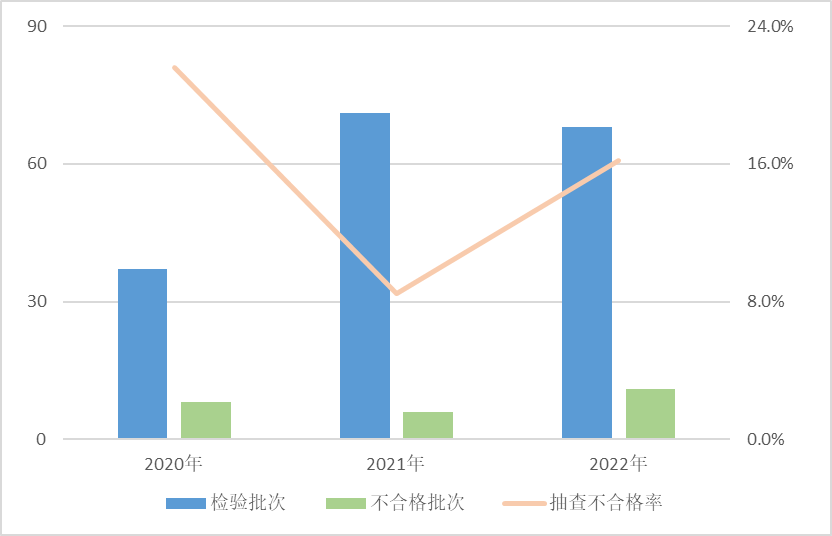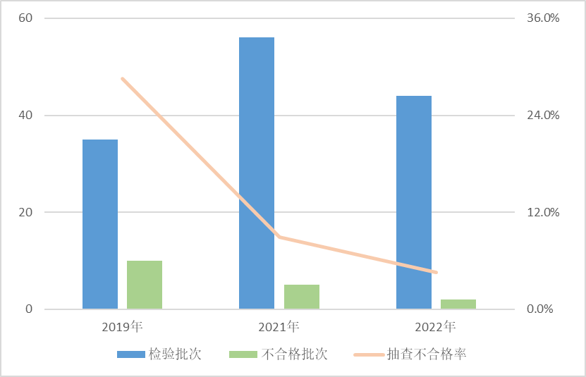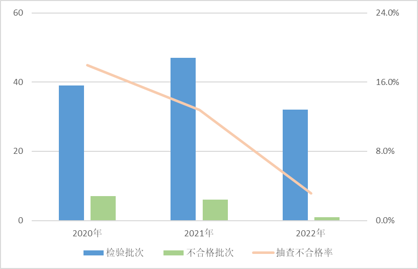 本次在流通領(lǐng)域抽查檢驗4個省(市)32家企業(yè)生產(chǎn)的32批次產(chǎn)品,發(fā)現(xiàn)1批次產(chǎn)品不合格,抽查不合格率為3.1%,較上次抽查下降9.7個百分點。該產(chǎn)品近3年抽查不合格率分別為17.9%、12.8%、3.1%。