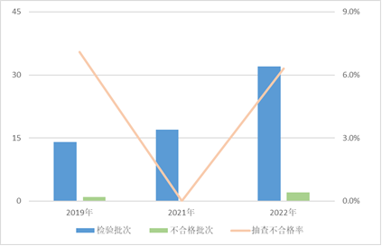 次在流通領(lǐng)域抽查6個?。ㄊ校?1家企業(yè)生產(chǎn)的32批次產(chǎn)品,共發(fā)現(xiàn)2批次產(chǎn)品不合格,抽查不合格率為6.3%。該產(chǎn)品近3次抽查不合格率分別為7.1%、0%、6.3%。
