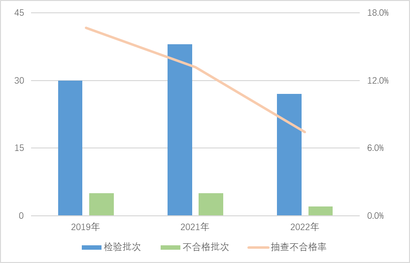 本次抽查6個?。ㄊ校?4家企業(yè)生產(chǎn)的44批次產(chǎn)品,發(fā)現(xiàn)2批次產(chǎn)品不合格,抽查不合格率為4.5%,較上次抽查下降4.4個百分點。該產(chǎn)品近3次抽查不合格率分別為28.6%、8.9%、4.5%。
