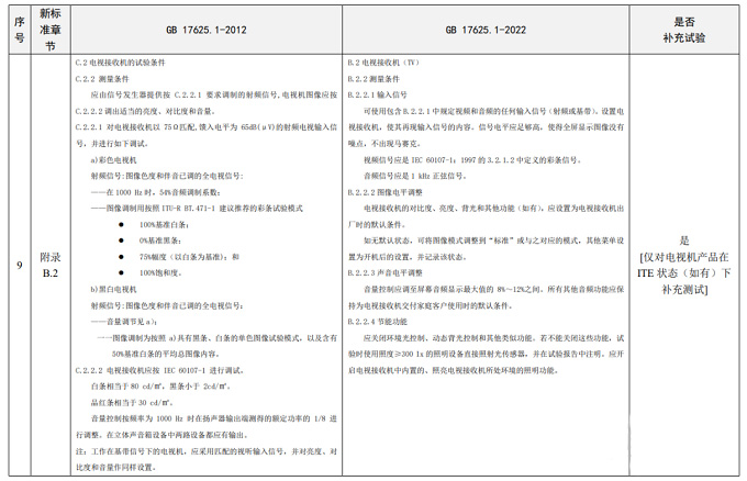 新標(biāo)準(zhǔn)更改了電視接收機的試驗條件,更加適合于當(dāng)下電視機的性能參數(shù)的配置,更改內(nèi)容主要體現(xiàn)在亮度調(diào)節(jié)、音量調(diào)節(jié)、節(jié)能功能等方面。需要注意的是,本次標(biāo)準(zhǔn)換版無需針對電視接收機功能對產(chǎn)品進行補充測試,僅需對電視機產(chǎn)品在ITE狀態(tài)(如有)下補充測試。