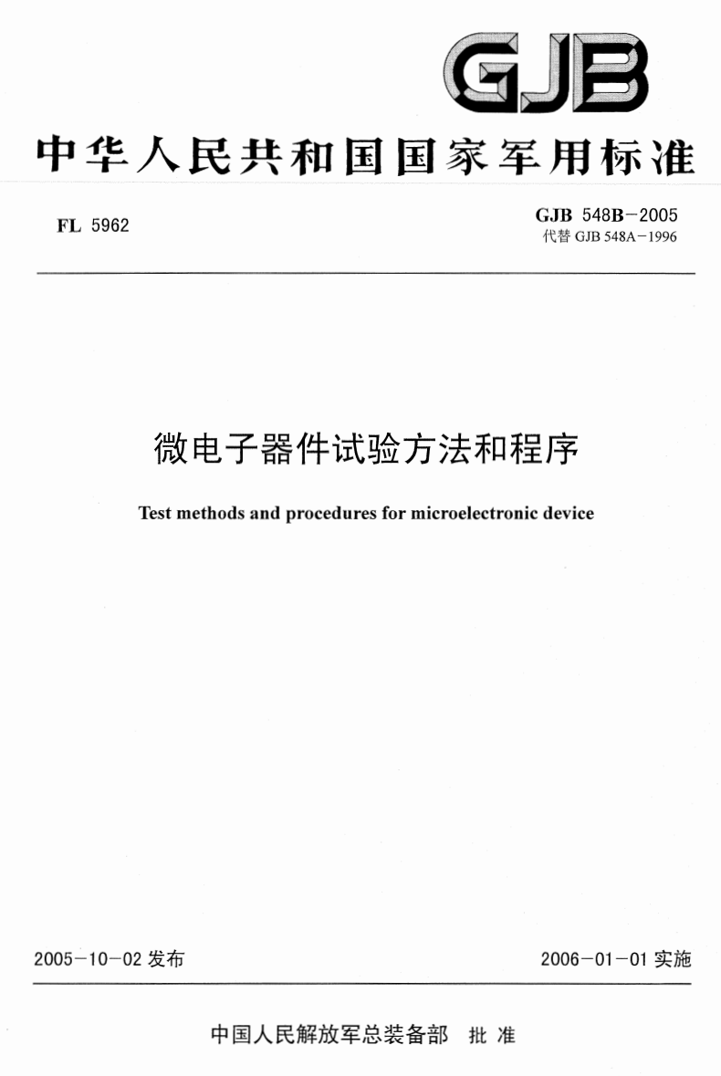 GJB548《微電子器件試驗方案和程序》規(guī)定了軍用微電子器件的氣候環(huán)境試驗、機械環(huán)境試驗、電學(xué)試驗和檢驗程序,以及為保證微電子器件滿足預(yù)定用途所要求的質(zhì)量和可靠性而必須的控制措施和限制條件。標準適用于軍用微電子器件。