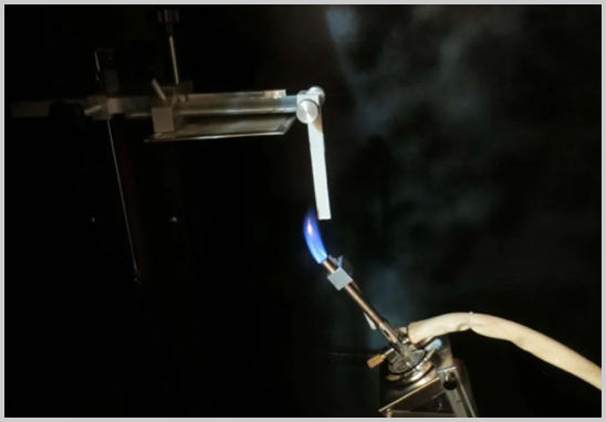 對(duì)樣條(130×13 mm)點(diǎn)火10mm,移走火源,記錄有焰燃燒時(shí)間,若在30mm自熄,則從新點(diǎn)燃10mm記錄有焰和無焰續(xù)燃時(shí)間,同時(shí)觀察是否產(chǎn)生有焰熔滴和熔滴是否引燃脫脂棉。