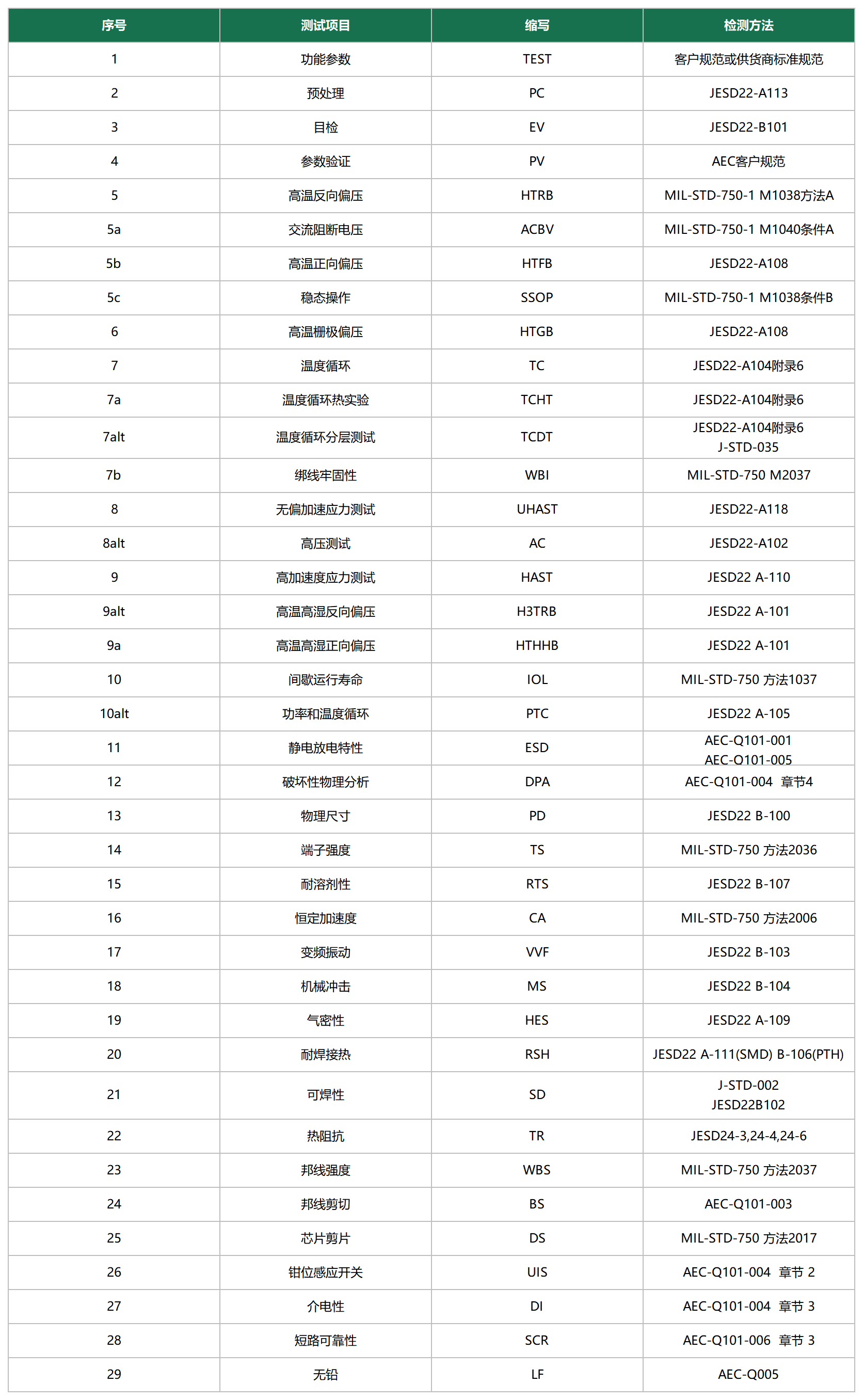 提供電子元器件的檢測提供整套測試儀器,可以為各類電子、電器制造廠商提供一下檢驗(yàn)測試項(xiàng)目的專業(yè)儀器設(shè)備:集成電路測試:成品測試、老化篩選、失效分析等;破壞性物理分析:外部目檢、X射線檢查、粒子噪聲(PIND)試驗(yàn)、密封性試驗(yàn)、內(nèi)部氣體成分分析、內(nèi)部目檢、內(nèi)引線鍵合強(qiáng)度、掃描電鏡、芯片剪切強(qiáng)度;可靠性壽命和老化篩選:老化篩選試驗(yàn)、穩(wěn)態(tài)壽命試驗(yàn)、加速壽命試驗(yàn)、可靠性強(qiáng)化試驗(yàn);環(huán)境試驗(yàn):正弦振動、隨機(jī)振動、機(jī)械沖擊、碰撞(或連續(xù)沖擊)、恒定加速度、跌落、出點(diǎn)動態(tài)監(jiān)測、溫度-振動-濕熱三應(yīng)力試驗(yàn)、高低溫低氣壓、溫度循環(huán)、熱沖擊、耐濕、高壓蒸煮、鹽霧或循環(huán)鹽霧、霉菌、淋雨、氣體腐蝕、沙塵、熱真空、強(qiáng)加速穩(wěn)態(tài)濕熱(HAST);物理性試驗(yàn):物理尺寸、耐溶劑性、引出端強(qiáng)度、可焊性、耐焊接熱、封蓋扭矩、鍍層厚度、阻燃性試驗(yàn)。