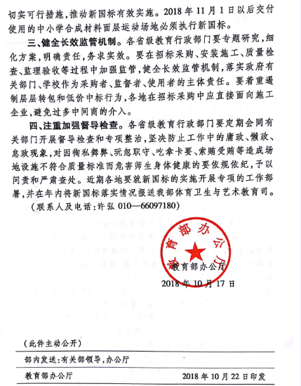 強(qiáng)制性國(guó)家標(biāo)準(zhǔn)GB36246-2018《中小學(xué)合成材料面層運(yùn)動(dòng)場(chǎng)地》(GB36246-2018,以下簡(jiǎn)稱(chēng)新國(guó)標(biāo))已由國(guó)家市場(chǎng)監(jiān)督管理總局和國(guó)家標(biāo)準(zhǔn)化管理委員會(huì)聯(lián)合印發(fā),將于2018年11月1日實(shí)施。為進(jìn)一步加強(qiáng)中小學(xué)合成材料面層運(yùn)動(dòng)場(chǎng)地建設(shè)管理,確保中小學(xué)校廣大師生的健康安全,現(xiàn)就有關(guān)工作要求通知如下: