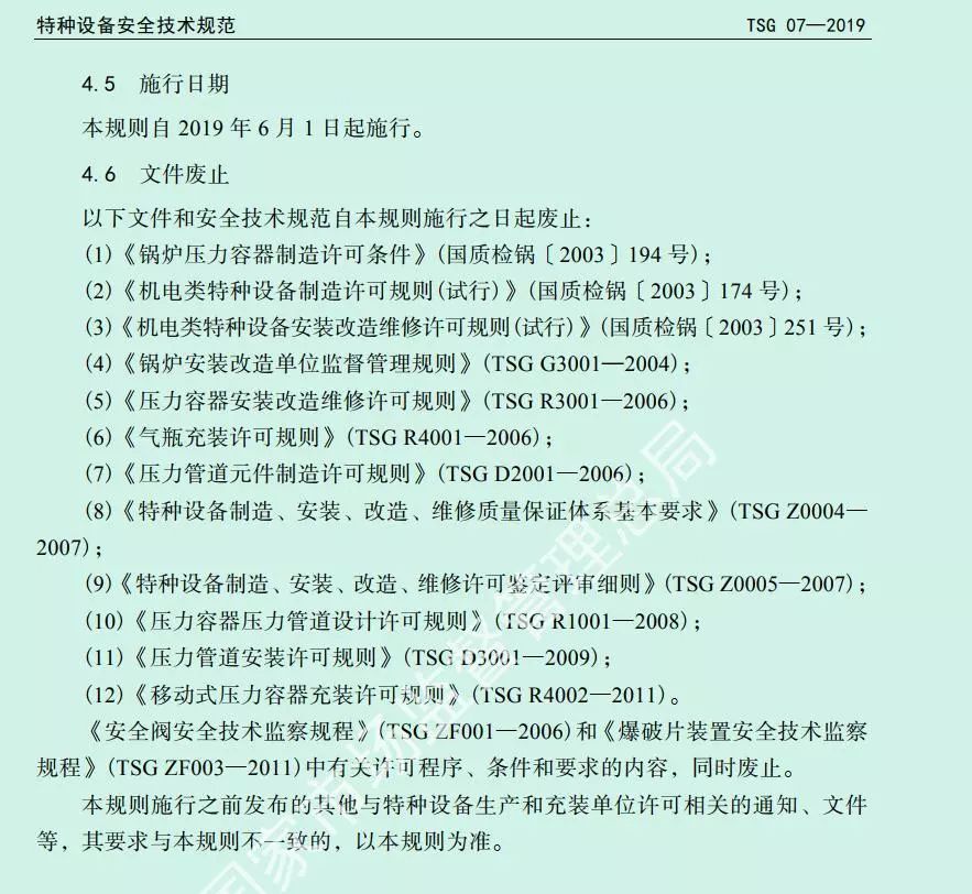 2019年5月22日,中國(guó)國(guó)家市場(chǎng)監(jiān)管總局發(fā)布《特種設(shè)備生產(chǎn)和充裝單位許可規(guī)則》的公告。公告主要內(nèi)容為宣布TSG 07—2019《特種設(shè)備生產(chǎn)和充裝單位許可規(guī)則》于2019年6月1日起實(shí)施。