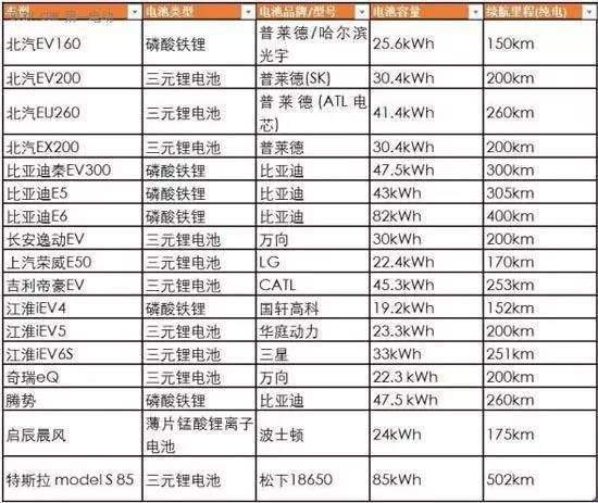 目前市面上主流純電動(dòng)車型所選用的電池類型: