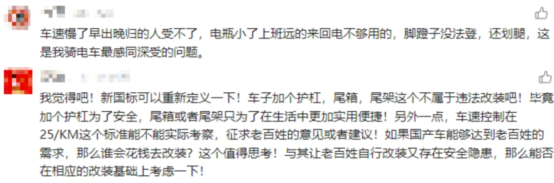 但在用戶端,電動自行車新國標(biāo)的某些規(guī)定,比如限速、限重、去尾箱、加腳踏等細(xì)則,卻飽受用戶詬病,上牌后私自改裝、加裝的現(xiàn)象屢禁不止,可以說,關(guān)于倡議電動車新國標(biāo)修訂的聲音,就從未停止過。