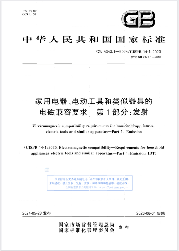 根據(jù)國(guó)家市場(chǎng)監(jiān)督管理總局(國(guó)家標(biāo)準(zhǔn)化管理委員會(huì))2024年第10號(hào)國(guó)家標(biāo)準(zhǔn)公告,GB 4343.1-2024《家用電器、電動(dòng)工具和類(lèi)似器具的電磁兼容要求 第1部分:發(fā)射》已批準(zhǔn)發(fā)布,新標(biāo)準(zhǔn)將于2026年6月1日正式實(shí)施,替代GB 4343.1-2018《家用電器、電動(dòng)工具和類(lèi)似器具的電磁兼容要求 第1部分:發(fā)射》。