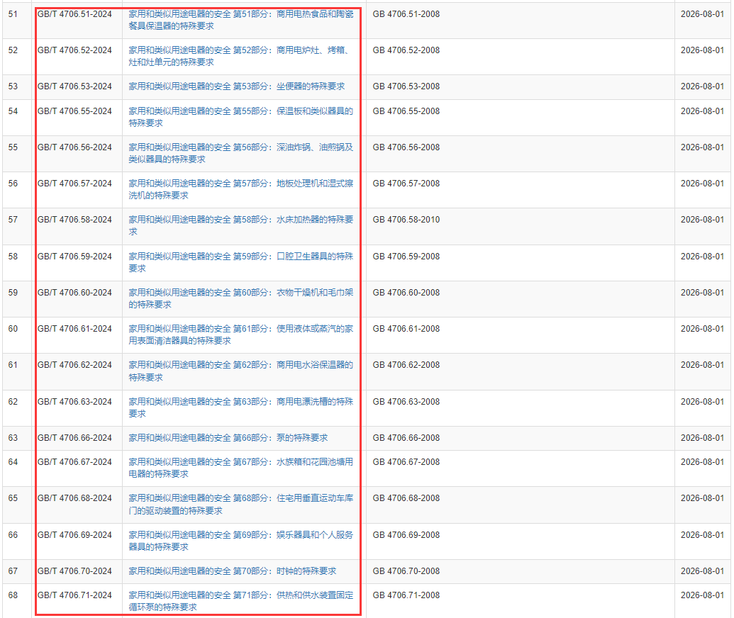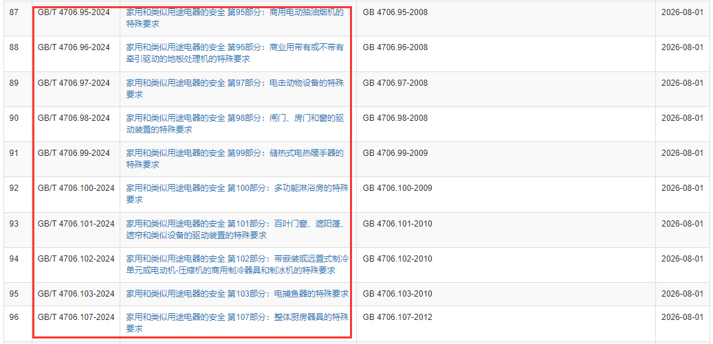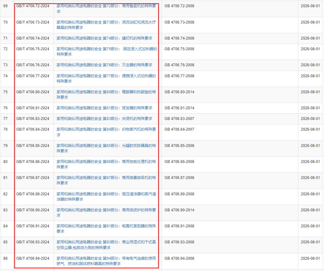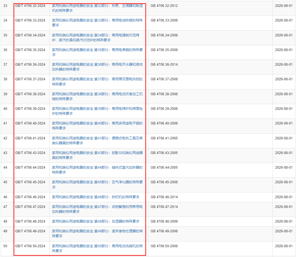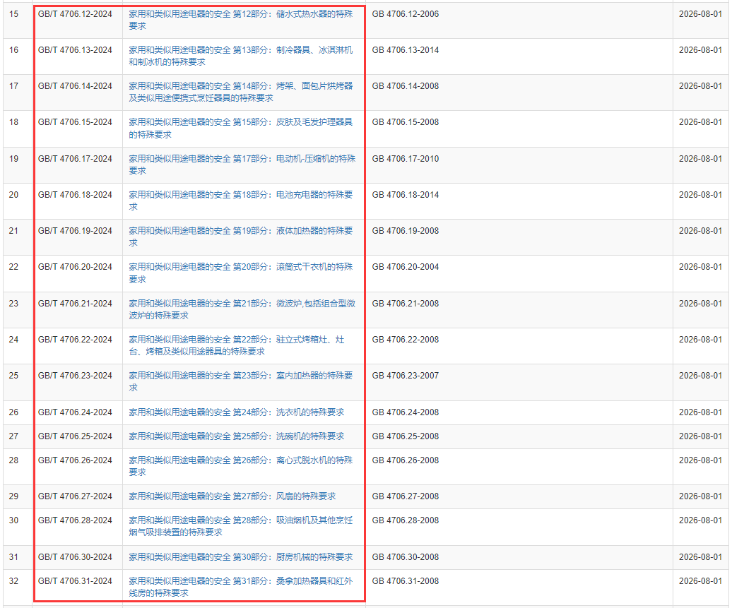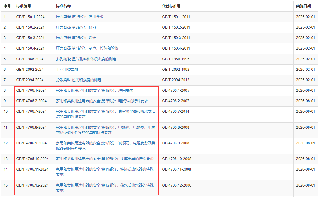 根據(jù)國(guó)家市場(chǎng)監(jiān)督管理總局(國(guó)家標(biāo)準(zhǔn)化管理委員會(huì))2024年第15號(hào)國(guó)家標(biāo)準(zhǔn)公告,GB/T 4706.1-2024家用和類似用途電器的安全 第1部分:通用要求已批準(zhǔn)發(fā)布,新標(biāo)準(zhǔn)將于2026年8月1日正式實(shí)施,替代GB 4706.1-2005家用和類似用途電器的安全 第1部分:通用要求》。
