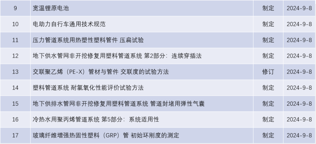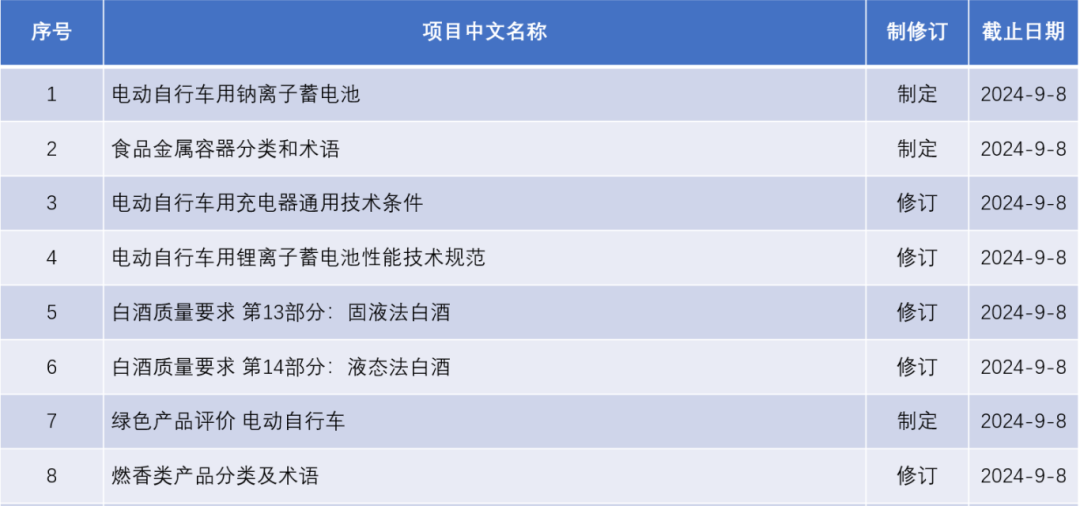 8月9日,國(guó)家市場(chǎng)監(jiān)督管理總局對(duì)80項(xiàng)擬立項(xiàng)國(guó)家標(biāo)準(zhǔn)項(xiàng)目公開征求意見,其中包括《電動(dòng)自行車用鈉離子蓄電池》《食品金屬容器分類和術(shù)語(yǔ)》《燃香類產(chǎn)品分類及術(shù)語(yǔ)》等17項(xiàng)輕工擬立項(xiàng)國(guó)家標(biāo)準(zhǔn)項(xiàng)目,征求意見截止時(shí)間為2024年9月8日,具體如下。