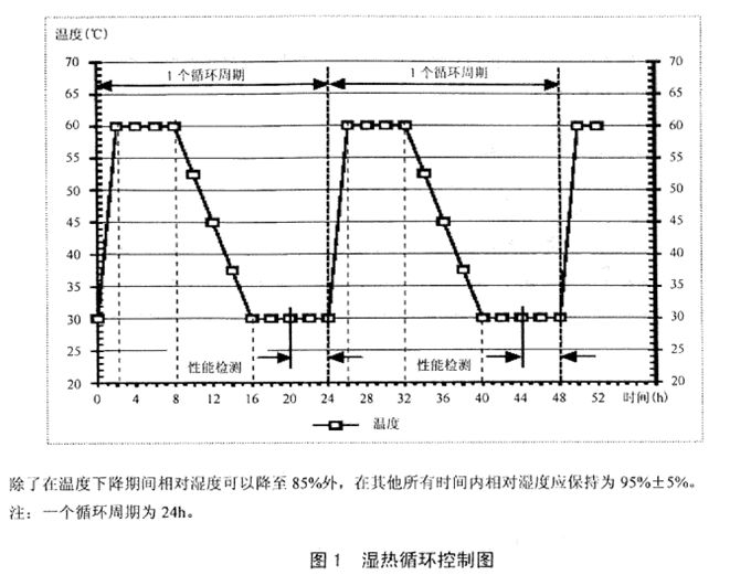 c)按圖1所示的試驗(yàn)條件暴露試件。試驗(yàn)周期數(shù)由4.3.2確定(一般為10個周期,一個周期為24小時)。對試件進(jìn)行性能檢測,推薦在第5個或第10個循環(huán)周期的末尾如圖1所示的時間段內(nèi)進(jìn)行,完成檢測所需時間為驗(yàn)證試件性能所需的最短時間。對試件進(jìn)行性能檢測也可按有關(guān)文件進(jìn)行。記錄檢測結(jié)果。如果試件出現(xiàn)故障,則終止溫濕度循環(huán),進(jìn)行步驟d)。若試件能正常工作,繼續(xù)試驗(yàn)。