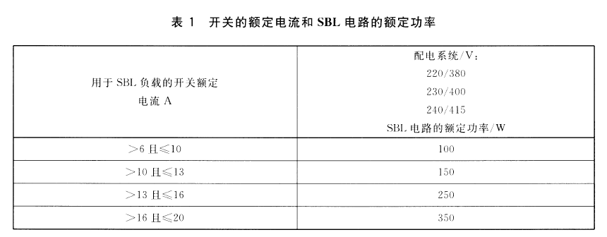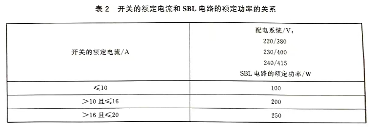 新版標(biāo)準(zhǔn)第6.2條的表2給出了開關(guān)的額定電流和 SBL電路的額定功率的關(guān)系,如下表所示: