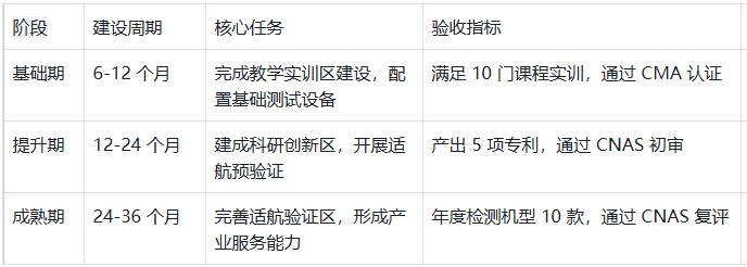 在基礎期,建設的重點是搭建教學實訓區(qū),為學生提供一個良好的實踐學習環(huán)境。配置基礎測試設備,如無人機飛行模擬器、基礎測試儀器等,滿足《無人機飛行原理與實踐》《無人機組裝與調(diào)試》等 10 門課程的實訓需求。同時,積極申請 CMA 認證,建立完善的質(zhì)量管理體系,確保實驗室的測試數(shù)據(jù)準確可靠,為后續(xù)的發(fā)展奠定堅實的基礎。