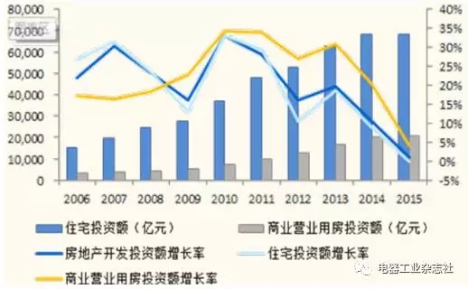 地產(chǎn)行業(yè)是終端電器和配電電器集中使用的行業(yè),中國(guó)房地產(chǎn)投資主要包括住宅投資和辦公樓及商業(yè)營(yíng)業(yè)用房投資兩個(gè)部分,在過去的20年內(nèi),我國(guó)房地產(chǎn)行業(yè)迎來了一波高速發(fā)展。2006年到2015年十年間我國(guó)房地產(chǎn)年投資額從1.9萬億增加至9.6萬億,年均增幅高達(dá)19.4%,可謂開創(chuàng)了一個(gè)房地產(chǎn)發(fā)展奇跡。