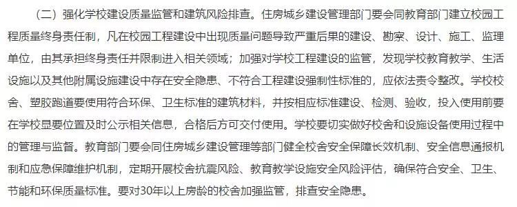 二是要求教育部門會同住房和城鄉(xiāng)建設(shè)等部門健全校舍安全保障長效機制、安全信息通報機制和應(yīng)急保障維護機制,定期開展校舍抗震風(fēng)險、教育教學(xué)設(shè)施安全風(fēng)險評估,確保符合安全、衛(wèi)生、節(jié)能和環(huán)保質(zhì)量標準;同時要對30年以上房齡的校舍加強監(jiān)管,排查安全隱患。