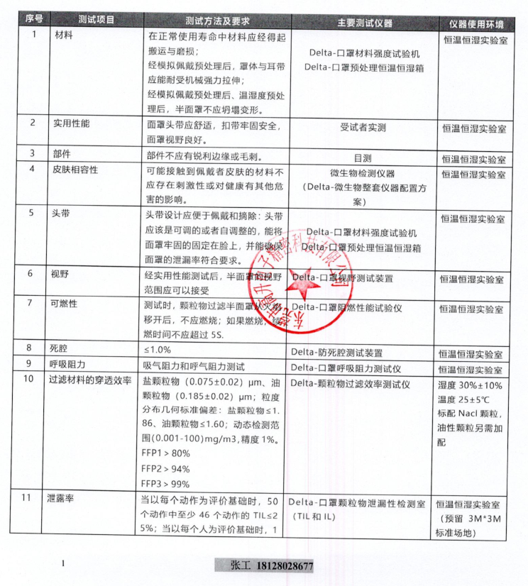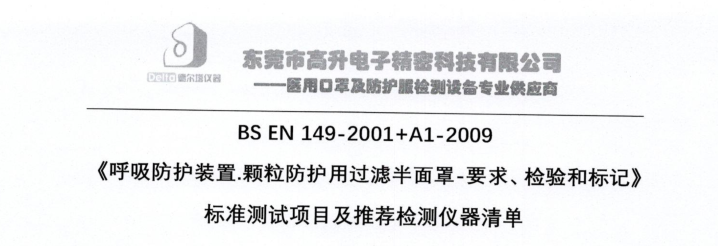 1、BS EN 149-2001+A1-2009 《呼吸防護裝置.顆粒防護用過濾半面罩-要求、檢驗和標(biāo)記》標(biāo)準(zhǔn)測試項目及推薦檢測儀器清單