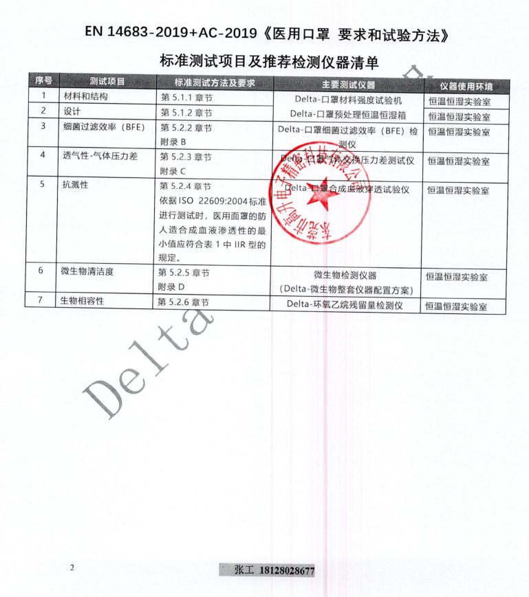 2、EN 14683-2019+AC-2019《醫(yī)用口罩 要求和試驗方法》標(biāo)準(zhǔn)測試項目及推薦檢測儀器清單