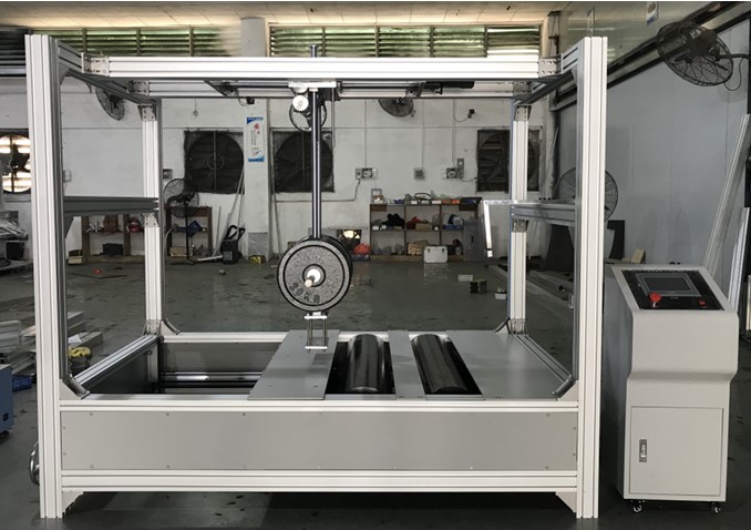 本機(jī)依據(jù) CNS6263-11 設(shè)計(jì)制造,其目的是模擬滑板車,溜冰鞋路況運(yùn)動(dòng)時(shí)底輪及車體之動(dòng)態(tài)耐用之程度(亦可用來作其它類產(chǎn)品之試驗(yàn)),為改善動(dòng)態(tài)耐用性之質(zhì)量提供可靠之依據(jù)。本機(jī)是通過馬達(dá)帶動(dòng)鏈輪運(yùn)動(dòng),從而帶動(dòng)滾筒轉(zhuǎn)動(dòng),并通過調(diào)節(jié)馬達(dá)轉(zhuǎn)速改變滾筒之轉(zhuǎn) 速來達(dá)到測試目的。