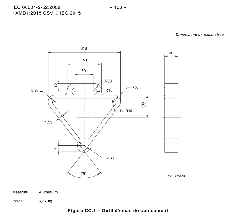 主要參數(shù)規(guī)格:楔形工具是根據(jù)IEC60601-2-52圖CC.1要求設(shè)計(jì)制作而成,用于評(píng)估醫(yī)療器械的V型開(kāi)口風(fēng)險(xiǎn)程度,被測(cè)區(qū)域是B和C的V形開(kāi)口,本三角形測(cè)試工具材質(zhì)為鋁,重量3.34kg.