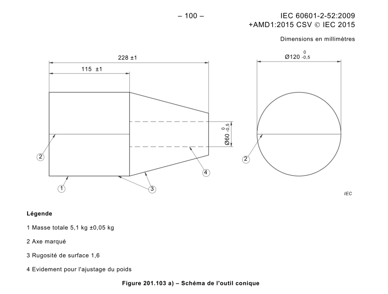 主要參數(shù)規(guī)格:錐形工具是根據(jù)醫(yī)用病床標(biāo)準(zhǔn)IEC60601-2-52圖201.103a設(shè)計(jì)而成,本錐形試驗(yàn)工具材質(zhì)為45#鋼,重量5.1±0.05kg。