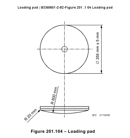 主要參數(shù)規(guī)格:加載墊工具符合IEC60601-2-52:2015標(biāo)準(zhǔn)中圖201.104設(shè)計(jì)而成,材質(zhì)為45#鋼。用于測(cè)試醫(yī)療器械的ME設(shè)備,直徑是¢355mm±5mm,沖擊器的表面有前沿半徑R20mm的,半徑R800mm的凸球面曲率,重31Kg。